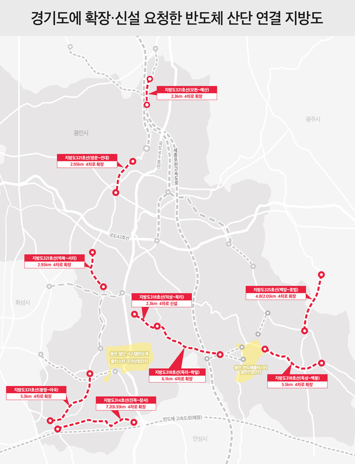 이동‧남사 시스템반도체 국가산단이나 이동 신도시에서 원삼 용인반도체클러스터까지 연결하기 위해 지방도 318호선 덕성~묵리 구간 2.3km에 왕복 4차로를 신설하고, 묵리~학일 구간 6.1km는 왕복 2차로를 4차로로 확장하자고 했다.