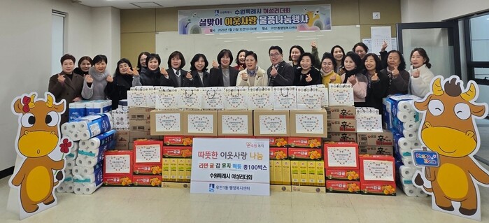 이날 우만1동행정복지센터에서 열린 ‘설맞이 이웃 물품 나눔 행사’에는 김수민 수원시여성리더회 회장 등이 참석했다.