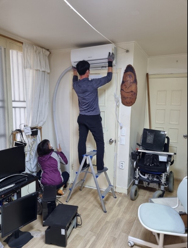 사진/ 수원시의 지원으로 취약계층 와상환자 가구에 냉방기를 설치하고 있는 모습.(사진제공=수원시)