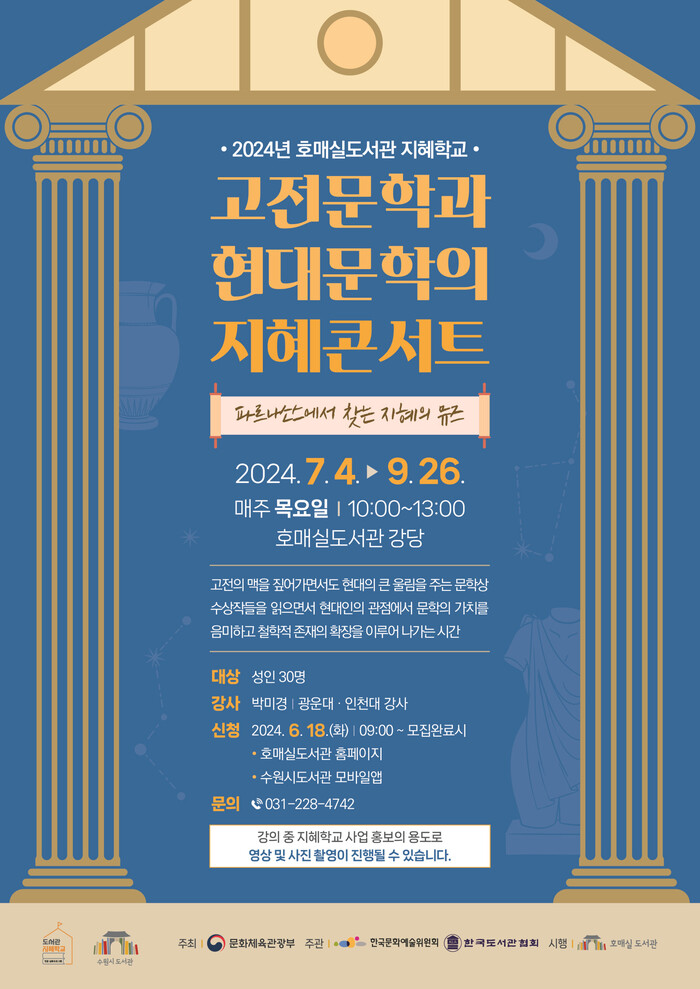 수원시 호매실도서관이 2024년 지혜학교 ‘고전문학과 현대문학의 지혜콘서트’ 참가자를 18일부터 모집한다.