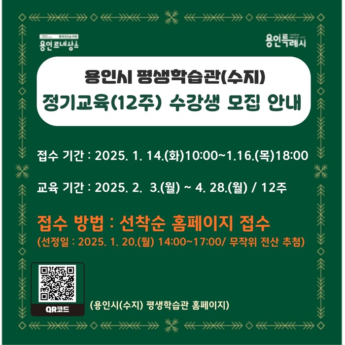 용인특례시(시장 이상일)는 14일부터 16일까지 용인시평생학습관(수지)의 ‘제58기 정기교육프로그램‘ 수강생을 모집한다고 13일 밝혔다.