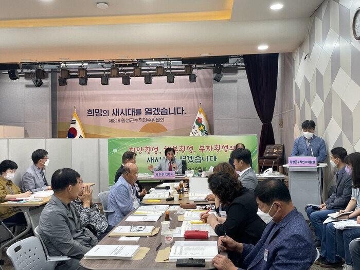 김명기 횡성군수 당선인은 14일부터 시작된 업무보고에 참석해 공약 실행을 위한 기틀을 다듬고 앞으로 나아갈 군정 방향을 제시하고 있다.