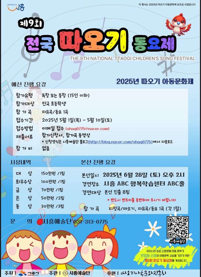 시흥시(시장 임병택)는 전국 초등학생을 대상으로 아동의 창의성과 재능을 발휘할 기회를 제공하고자 5월 1일부터 10일까지 ‘2025년 제9회 전국 따오기아동동요제’에 참여할 독창자와 중창팀을 모집한다.