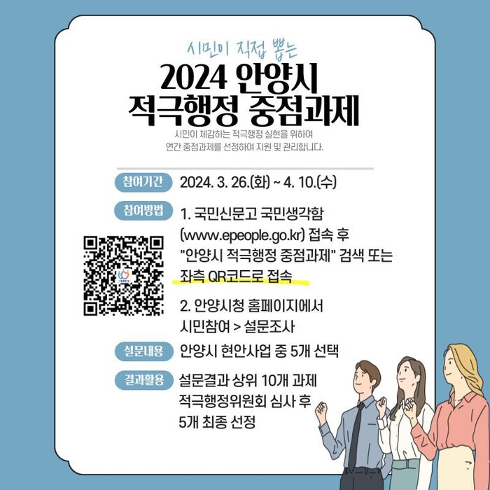 투표는 오는 10일까지 국민권익위원회의 ‘국민생각함(www.epeople.go.kr)’의 생각모음란에서 ‘2024년 안양시 적극행정 중점과제’를 검색해 참여할 수 있다. 또는 안양시청 홈페이지의‘설문조사’게시판에서도 참여할 수 있다.