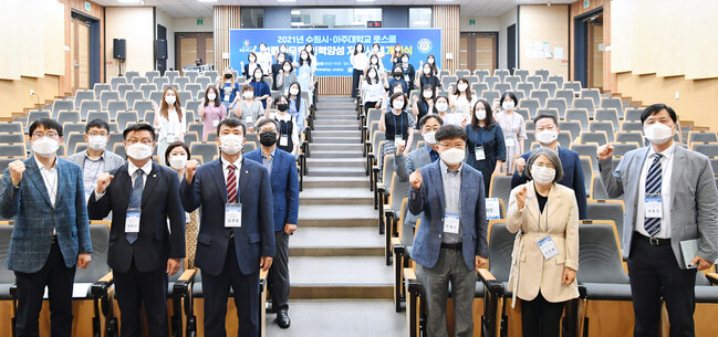 사진/ ‘로스쿨 법률사무원 인력양성 지원 사업’ 개강식에서 교육생과 수원시·아주대 로스쿨 관계자들이 함께하고 있다.(사진제공=수원시)