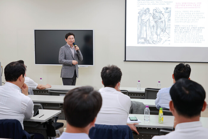 이상일 용인특례시장은 12일 저녁 용인특례시청 1층 울산과학기술원(UNIST) 반도체 교육‧산학 허브에서 UNIST 제1기 반도체 최고위과정 원우생 13명을 대상으로 인문학 특강을 진행했다.