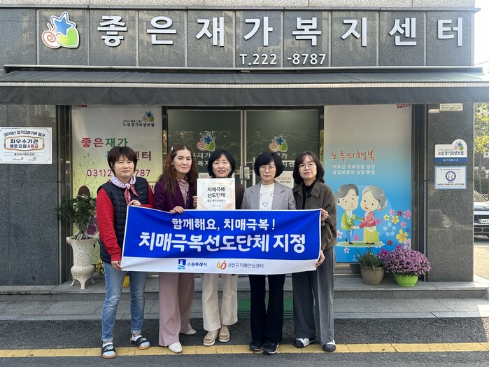 수원시 권선구보건소가 30일 치매극복선도단체로 지정한 좋은재가복지센터, 효자노치원 서수원점에 현판을 전달하고, 치매 극복 협력 사항에 대해 논의했다.