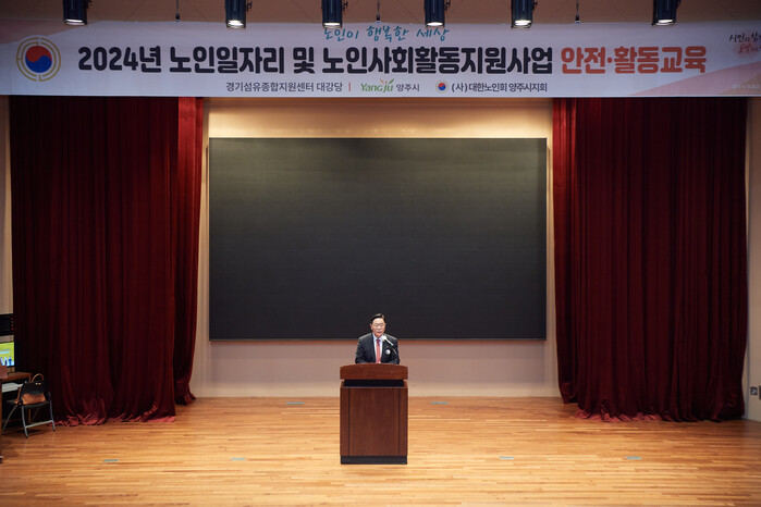 강수현 양주시장이 27일 오후 경기섬유종합지원센터 대강당에서 진행된 (사)대한노인회 양주시지회 주관(지회장 이채용) ‘2024년 노인일자리 및 사회활동지원사업 안전·활동 교육’ 현장을 방문했다.
