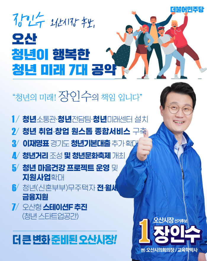 장인수 후보는 “젊은 도시 오산에 걸맞는 젊고 참신한 청년정책이 필요하다”며 “청년의 미래를 응원하는 오산시로 자리매김할 수 있도록 청년 정치인이자 오산시의회 의장으로서 적극 나서겠다”고 밝혔다.