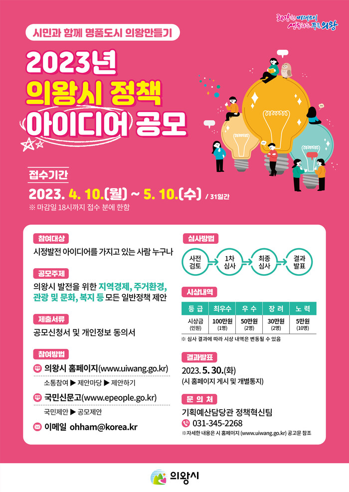 김성제 의왕시장은 “이번 공모를 통해 시민들의 목소리를 시정에 적극 반영하는 소통행정을 추진할 것”이라며 “2023년 의왕시 정책 아이디어 공모에 시민들의 많은 관심과 적극적인 참여를 부탁드린다”고 말했다.