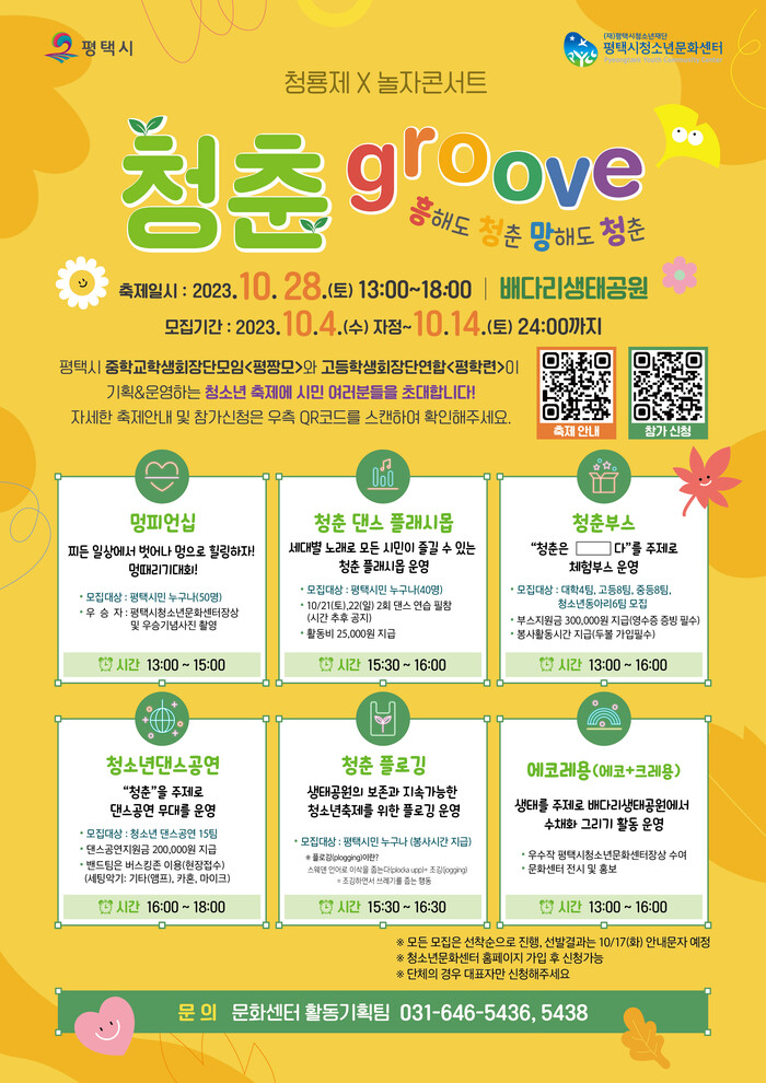 평택시(시장 정장선)와 평택시청소년문화센터(센터장 곽지숙)는 청소년축제 ‘청춘 GROOVE’에 참가할 청소년을 오는 14일까지 모집한다고 밝혔다.