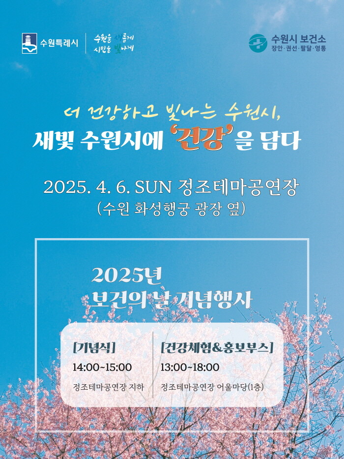 수원시 관계자는 “보건의 날을 맞아 시민들이 건강의 중요성을 다시 한번 인식하고, 생활 속에서 실천할 수 있도록 다양한 체험 프로그램을 준비했다”며 “건강한 지역사회를 만들기 위해 지속해서 노력하겠다”고 말했다.