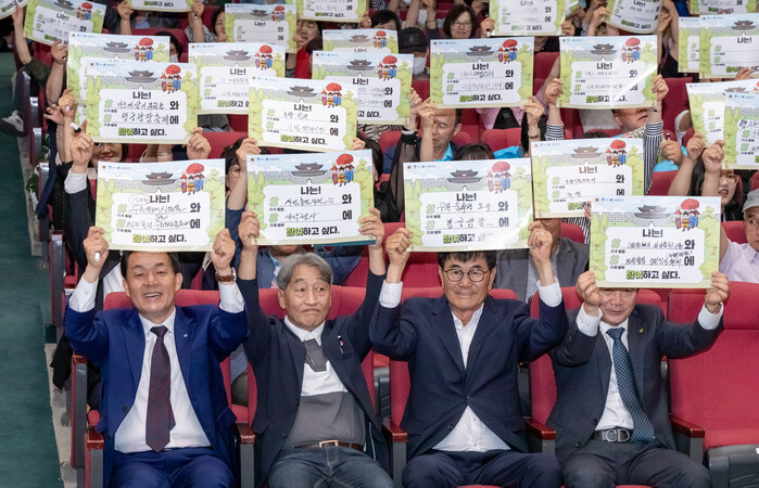 사진/이재준 수원시장 등 참석자들이 설명회에서 손팻말을 들고 있다.(사진제공=수원시)