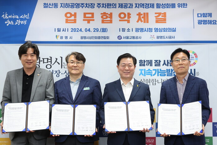 이번 협약에는 광명시와 광명시상인회총연합회(회장 심국섭), 철산역을 관리하는 서울교통공사(철산역장 김현식), 주차장을 운영하는 광명도시공사(사장 서일동)가 참여했다.
