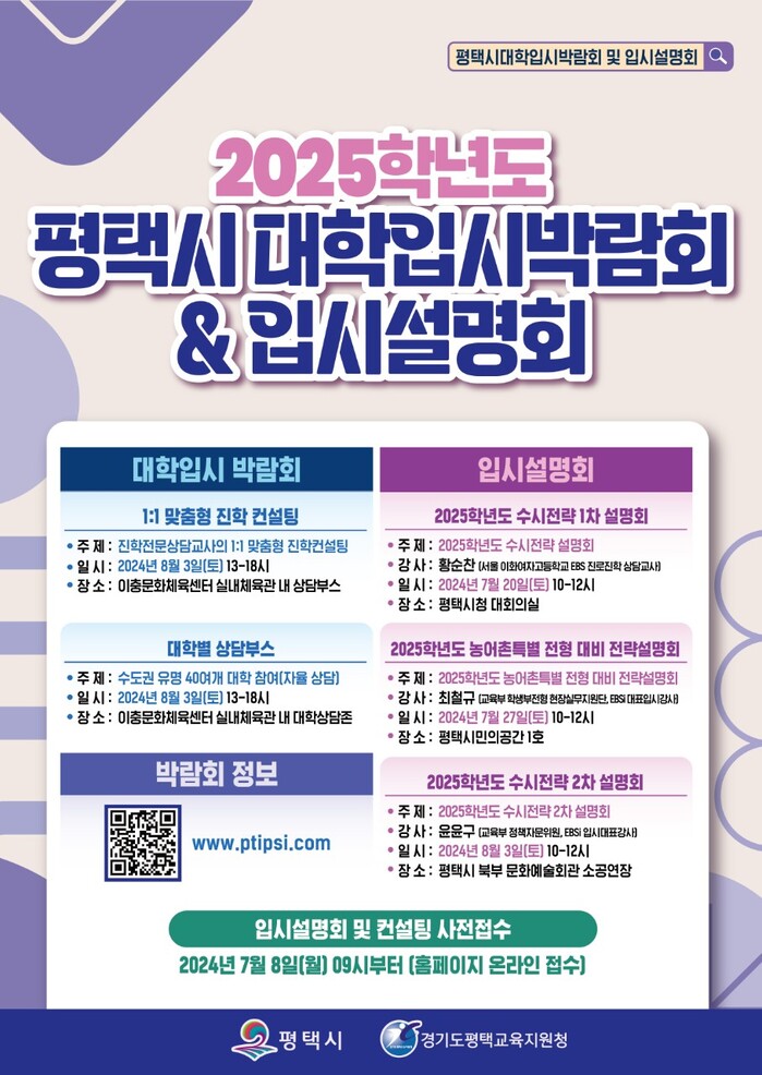 평택시(시장 정장선)가 수험생과 학부모들에게 최신입시 정보 제공을 위한 ‘2025학년도 대학입시박람회 및 설명회’를 개최한다.