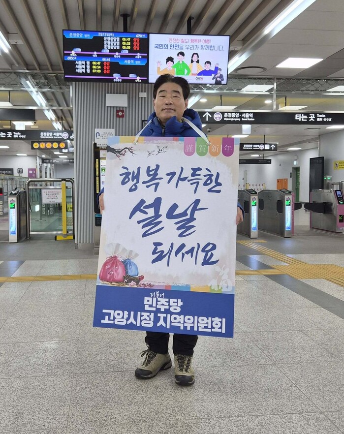 [고양=로컬라이프] 송준형 기자 = 김운남 고양특례시의회 의장은 일산역에서 킨텍스역에서 "행복한 설 명절 보내십시오!" 라며 주민분들께 인사를 드렸다.