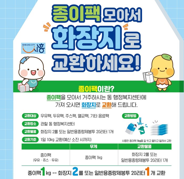 시흥시(시장 임병택)는 자원재활용을 위해 종이팩을 주방용 종이 행주(키친타월) 또는 종량제 봉투로 교환해 주는 사업을 올해도 지속 추진한다.