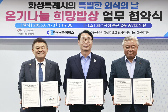 (사)화성시자원봉사센터(이사장 정명근)는 17일 시청 중앙회의실에서 화성상공회의소 및 (사)한국외식업중앙회 경기도남부지회 화성시지부와 ‘화성특례시의 특별한 외식의 날(온기나눔 희망밥상)’ 업무 협약을 체결했다.