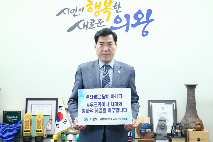 김상돈 의왕시장은 2일 최용덕 동두천시장의 지명으로 ‘남북평화협력 지방정부협의회 전쟁반대 챌린지’에 동참하면서 우크라이나 사태에 대한 평화적 해결을 촉구했다.