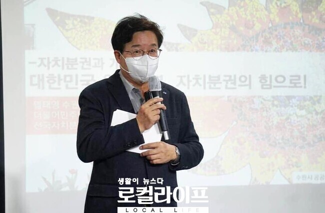 [수원=로컬라이프] 송준형 기자 = 염태영 수원시장이 11일, 더불어민주당 경기도당이 주최한 ‘지방자치 아카데미’에서 “자치분권과 개헌”을 주제로 강연을 했다.