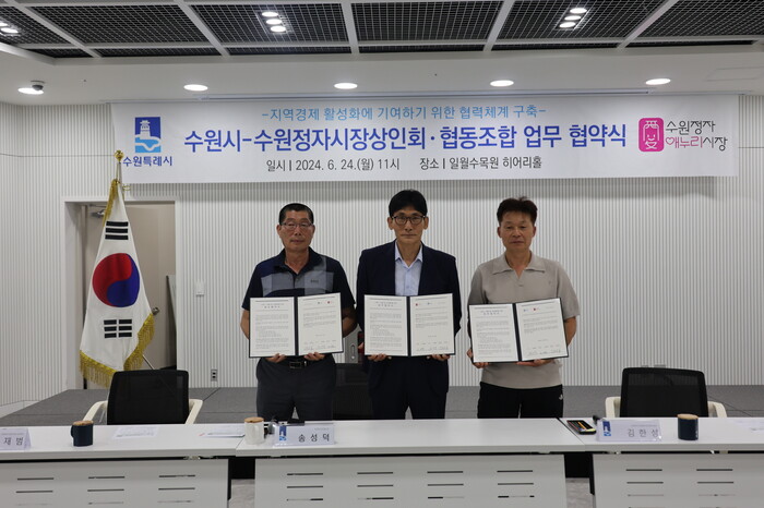 두 기관은 24일 일월수목원 히어리홀에서 ‘수원시·전통시장 상생협력을 위한 업무협약’을 체결하고, 협력을 약속했다. 이날 협약식에는 송성덕 공원녹지사업소장, 이재범 수원정자시장상인회장, 김한성 수원정자시장협동조합장 등 업무 관계자가 참석했다.