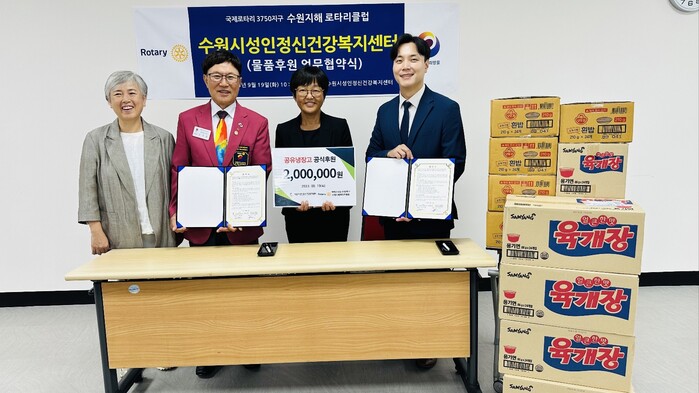 수원시는 19일 센터 대강당에서 수원공유냉장고 25호점 개소식을 열었다. 국제로타리 3750지구 수원지해로타리클럽은 개소식에 앞서 수원시와 협약을 체결하고, 내년 6월까지 공유냉장고를 채울 음식물을 후원하기로 했다.