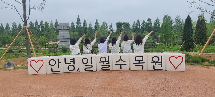 사진/보육교사들이 일월수목원을 방문해 기념사진을 촬영하고 있다.(사진제공=수원시)