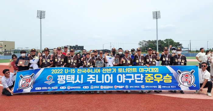 평택시주니어야구단(단장 유승영)은 총 26개 팀이 참가해 지난 4월 16일부터 6월 12일까지 2개월 동안 치러진 2022 U-15 전국주니어 전반기 리그전 주말야구대회에서 결승 상대로 영등포구와 맞붙은 끝에 준우승을 기록했다.