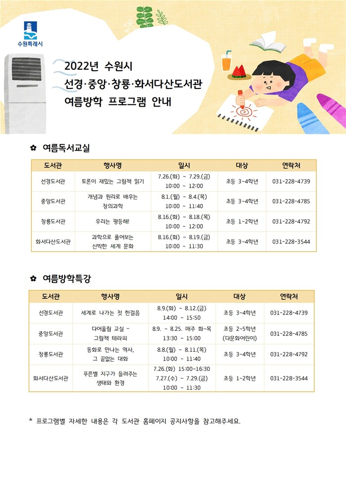 수원시 선경·중앙·창룡·화서다산도서관이 여름방학을 맞아 어린이를 대상으로 ‘2022년 여름방학 프로그램’을 운영한다.