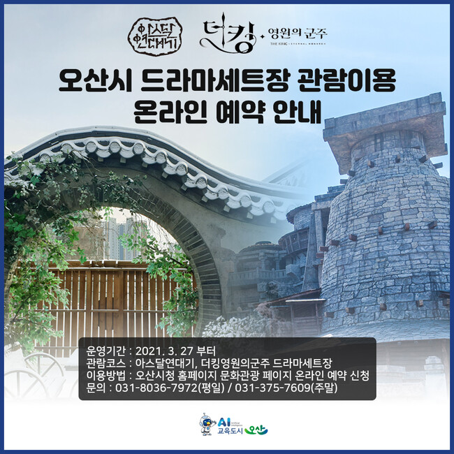 오산시(시장 곽상욱)는 코로나19 확산으로 그동안 개방하지 못한 내삼미동‘아스달연대기’, ‘더킹:영원의군주’드라마세트장을 방역 지침을 준수하여 3월 27일(토)부터 온라인 사전예약제로 운영할 계획이라고 24일 밝혔다.