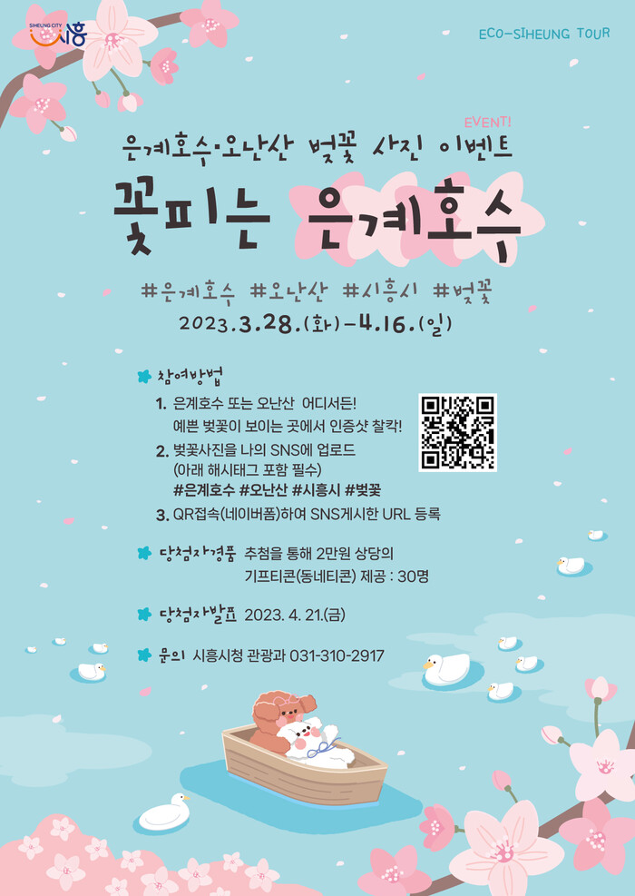 시민 누구나 이벤트에 참여할 수 있으며, 은계호수 및 오난산에서 예쁜 벚꽃과 함께 촬영한 사진을 개인 누리소통망(SNS)에 해시태그(#은계호수, #오난산, #시흥시, #벚꽃)를 포함해 올린 후. 포스터의 QR코드에 접속해 자신이 게시한 인스타그램 및 블로그 링크를 등록하면 참여가 완료된다.