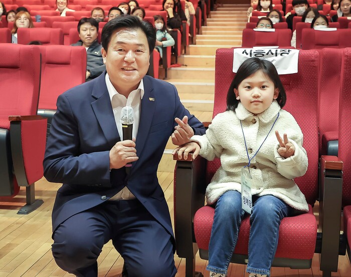 그러면서 식전행사로 짧은 마술공연이 있어서 앞자리를 비켜줬는데, 눈맑은 정예담어린이가 용감하게 달려와 시흥시장 자리에 앉으셨다. 반가운 마음에 인증샷도 남겼다고 말했다.