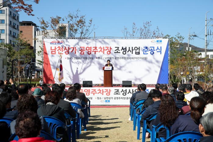 김 시장은 이어 이번 남천상가 공영주차장은 2021년 3월에 착공하여 오늘 준공식을 했다며, 지상 1층은 잔디가 펼쳐진 공원으로 유지하였고, 지하 2층은 주차 공간으로 주차면 수는 총 224면이라고 전했다.