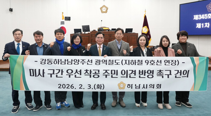 금 의장은 제안설명을 통해 “3차례 유찰된 2공구(하남 망월~남양주 다산)의 공기 지연이 전체 사업의 발목을 잡아서는 안 된다”라며 “시공이 상대적으로 용이하고 수요가 폭발적인 서울 강동(943 정거장)과 하남 미사(944 정거장) 구간을 분리하여 우선 착공함으로써 사업의 추진 동력을 확보하고 시민들의 극심한 교통난을 선제적으로 해결해야 한다”라고 강조했다.