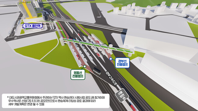 상공형 환승정류장은 GTX용인역 인근 경부고속도로 상부에 보행자 다리를 연결해 GTX에서 고속도로는 물론 버스와 지하철(구성역)로 편리하게 환승할 수 있도록 한 것이다.