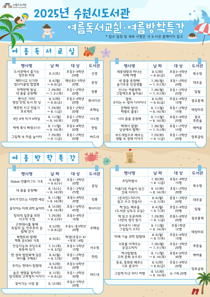 수원시도서관 관계자는 “여름방학을 맞아 수원시도서관에서 풍성한 프로그램을 운영한다”며 “아이들이 수원시도서관에서 책과 가까워지고 다양한 체험을 하며 유익한 시간을 갖길 바란다”고 밝혔다.