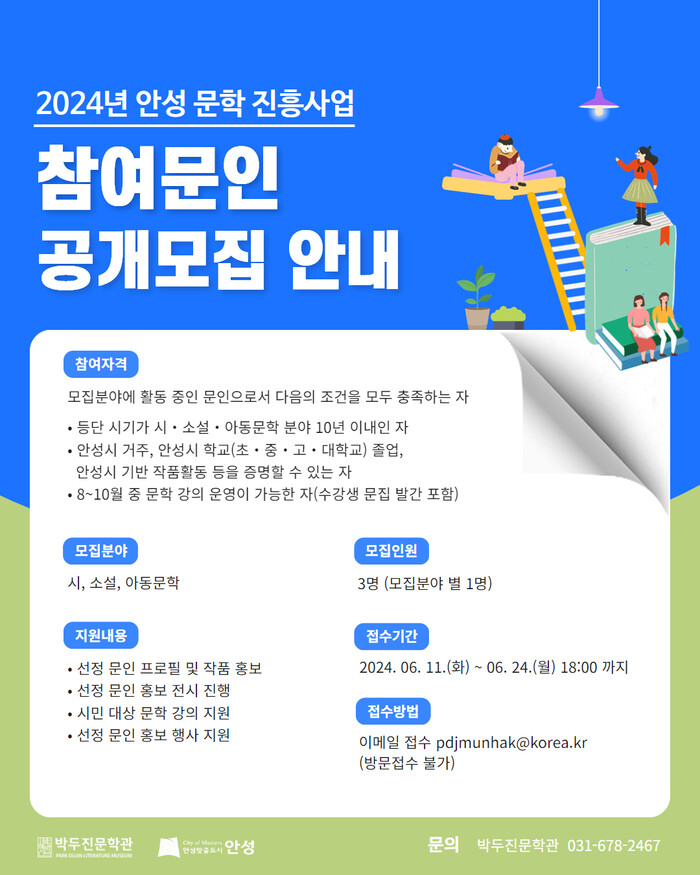 안성시 박두진문학관은 6월 11일(화)부터 6월 24일(월)까지 2주간 「2024년 안성 문학 진흥사업」의 참여 문인을 모집한다고 밝혔다.