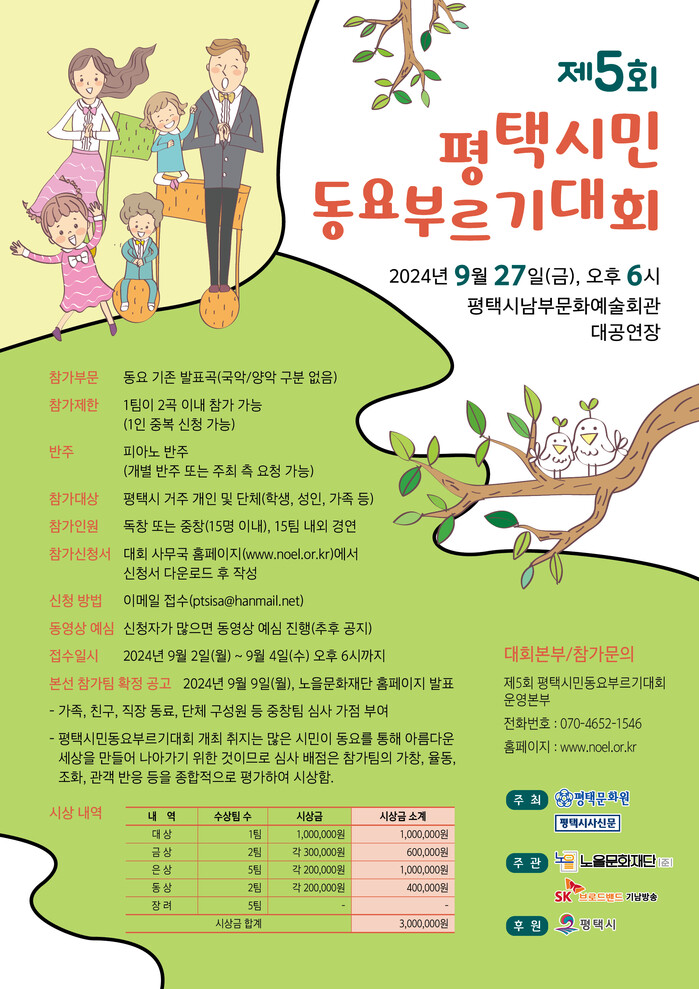 한편, ‘제5회 평택시민동요부르기대회’는 평택문화원과 평택시사신문이 주최하고, 노을문화재단과 SK브로드밴드 기남방송이 주관하며 평택시가 후원한다.