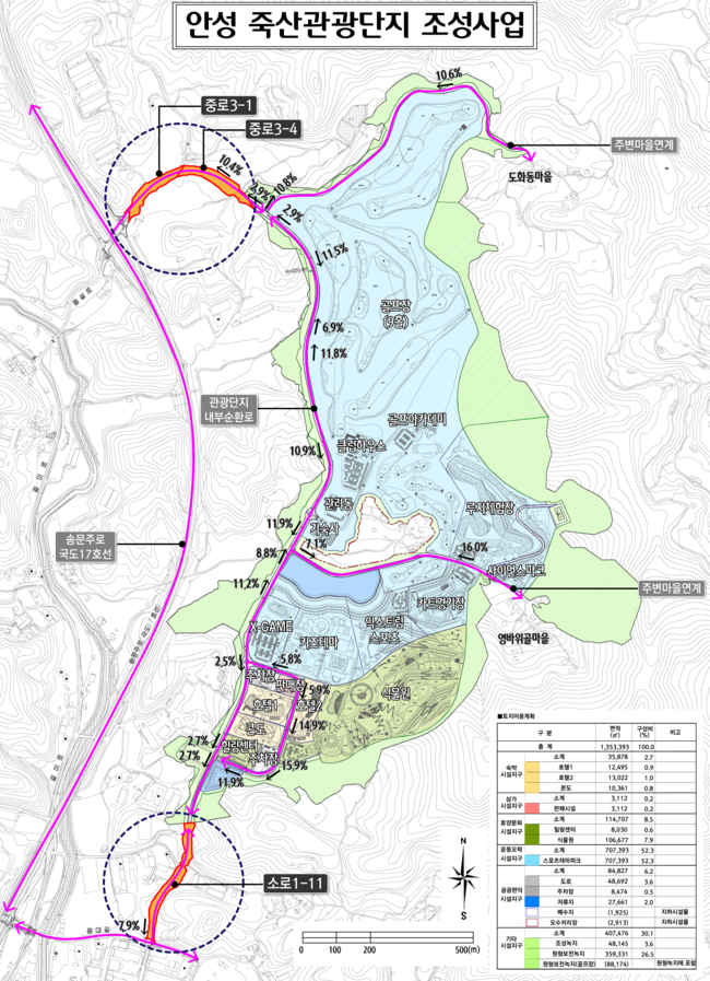 죽산관광단지는 1단계에 ▲180실 규모 호텔(안전체험관 포함) ▲스포츠 테마파크(대중골프장·루지·카트·익스트림 스포츠·X-게임장 등)를 본격적으로 조성하고, 2단계에 ▲160실 규모 호텔 및 70실 규모 콘도 ▲식물원 및 힐링센터, 판매시설 등을 도입함으로써 온 가족이 함께 즐길 수 있는 공간으로 활성화할 계획이다.