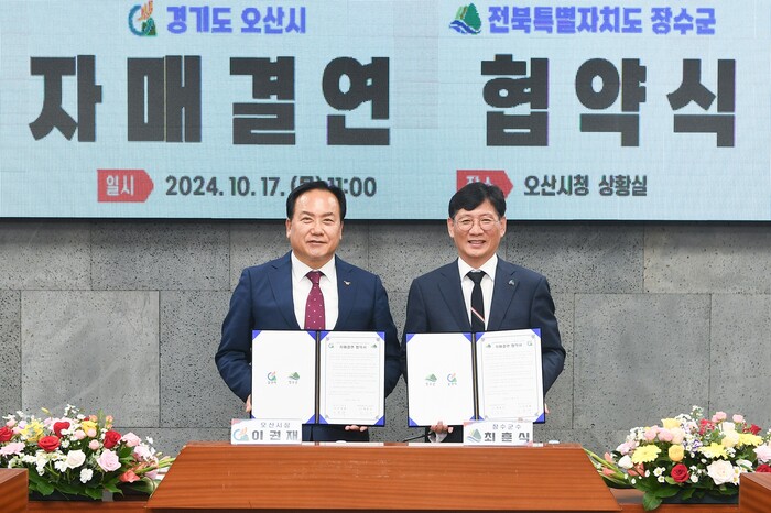 경기도 오산시(시장 이권재)와 전북특별자치도 장수군(군수 최훈식)이 17일 오전 오산시청 상황실에서 자매결연 협약식을 맺고 상생발전 및 공동발전 협력 강화에 나서기로 했다.
