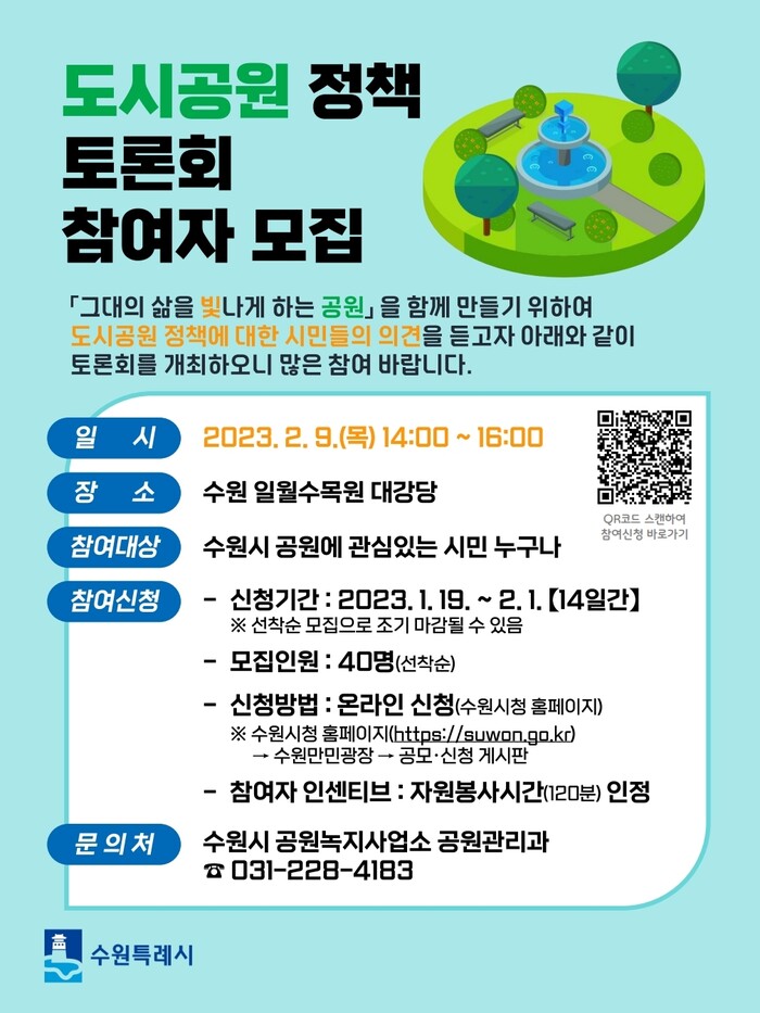 수원시가 2월 9일 오후 2시 일월수목원 강당에서 열리는 ‘2023년 도시공원 정책토론회’에 참여할 시민 40명을 19일부터 선착순으로 모집한다.