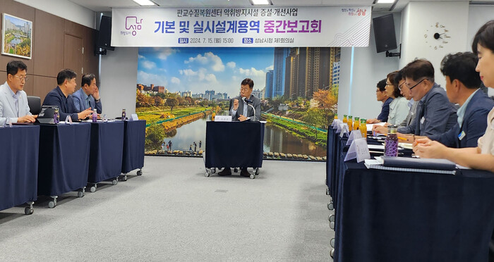 이와 관련해 성남시는 15일 오후 3시 시청 4층 제1회의실에서 신상진 성남시장 등 20여 명이 참석한 가운데 판교지역 하수처리 악취 저감을 위한 설계 용역 중간 보고회를 개최하고 진행 상황을 짚어나갔다.