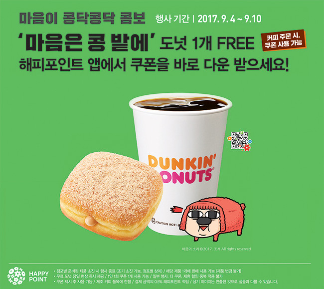 던킨도너츠가 9월 이달의 도넛 ‘마음은 콩밭에’ 출시 기념으로, ‘마음은 콩밭에’ 도넛 1개 무료 쿠폰을 증정한다고 밝혔다. 이 쿠폰은 매장에서 모든 제조커피 구입시 사용할 수 있으며, 행사기간은 9월 4일부터, 10일까지 7일이다.