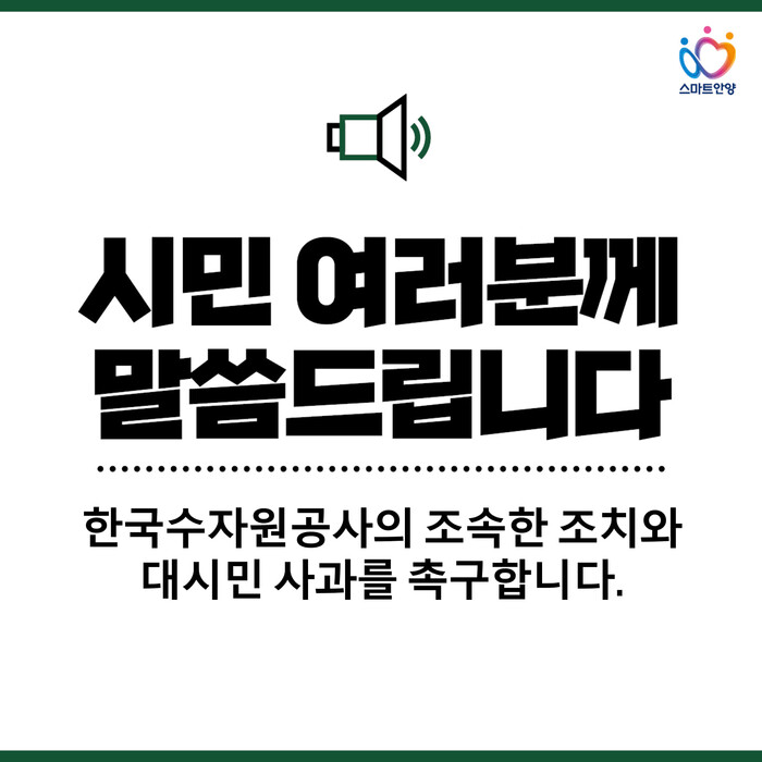 아울러 한국수자원공사는 이번 사태로 불편을 겪고 있는 안양시민에게 아직 이렇다 할 사과가 없는 상태라며, 안양시는 다시 한번 한국수자원공사의 신속한 후속 조치 및 발생한 사태에 대한 사과와 보상을 강력하게 촉구한다고 밝혔다.