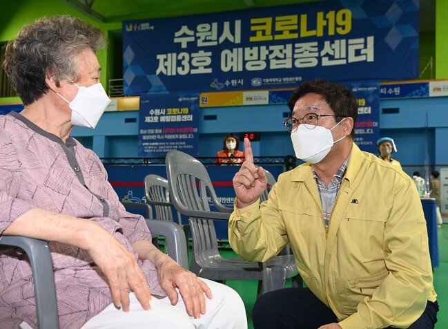 이날 수원 3호 예방접종센터가 설치된 수원종합운동장 내 수원국민체육센터를 방문한 염태영 시장은 예방접종센터 관계자들을 격려하고, 접종센터를 찾은 어르신들과 이야기를 나눴다. 수원 3호 예방접종센터는 지난 4월 29일 운영을 시작했다.