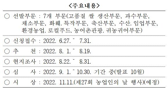 신청.접수는 오는 27일부터 7월 31일까지 읍면동장과 지역농협장, 축협, 과수, 수산업협동조합, 산림조합장 등에게 신청하고, 8월 19일까지 읍면동장과 조합장이 부문별 수상 후보자를 평택시장에게 추천하게 된다.