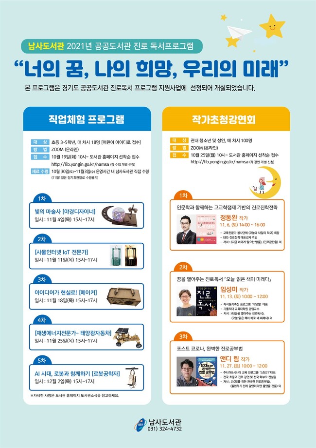 한편 이번 프로그램은 경기도가 주관하는 ‘2021년 공공도서관 진로 독서문화 프로그램 지원사업’에 선정돼 마련했다.