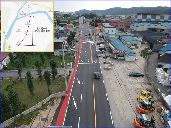 구는 예산을 확보하고 지난 3월부터 공사를 시작해 통행량이 많은 천리 방향 도로 SK승원주유소부터 제1천리교 앞까지 약 520m 구간을 차선 조정과 전신주 등 지장물을 이설해 편도 1차로에서 2차로로 확장했다.