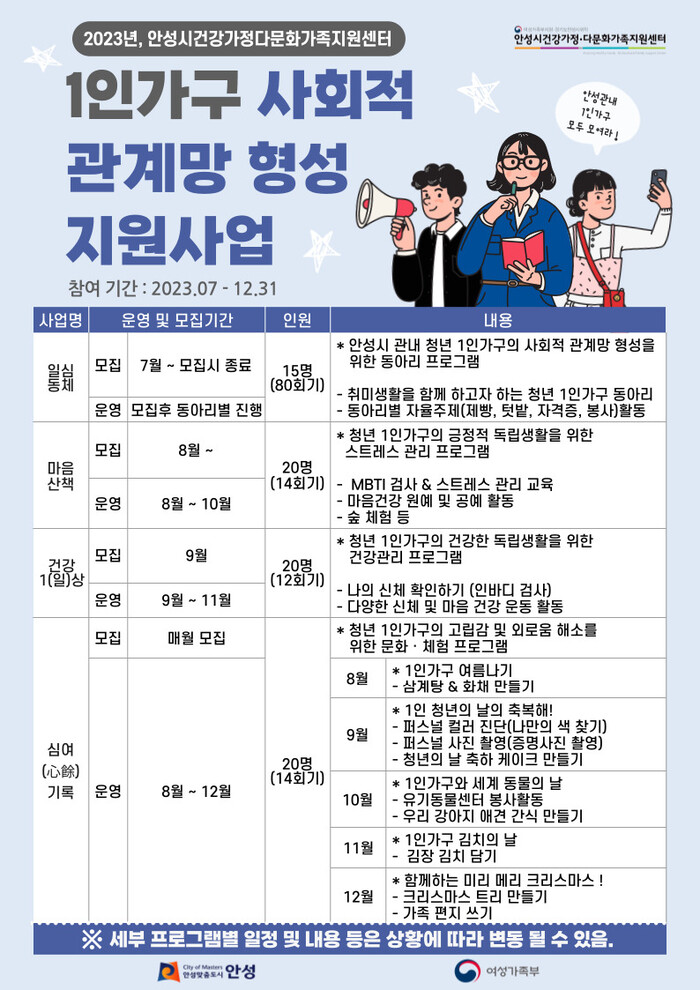 본 사업은 안성 관내, 주민등록등본 또는 기타 추가 서류를 통해 확인 가능한 실거주 1인가구(1명이 단독으로 생계를 유지하고 있는 생활 단위)를 대상으로 진행되며, 선착순이 아닌 우선순위 선발을 통해 프로그램이 진행될 예정이다.