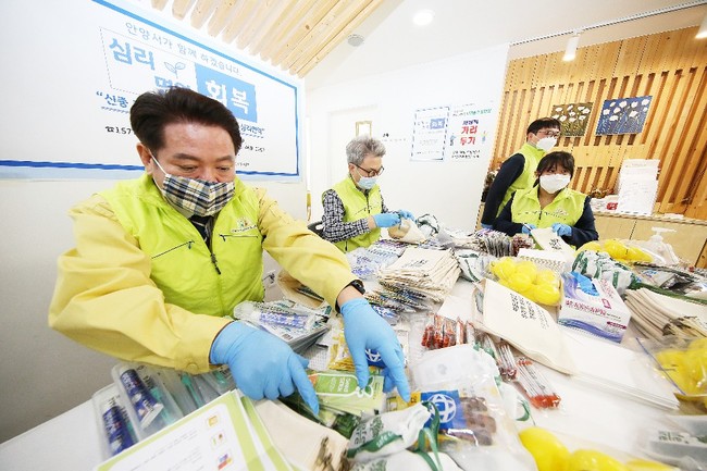 최대호 안양시장이 1일 보건소 관계자들과 함께 자가격리자들에게 제공할 심리방역키트를 제작하며, 현 난국에 대한 고뇌를 피력했다.